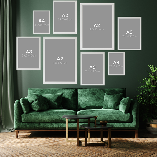 8 Piece White Wooden Picture Frame Set, 2x A2, 4 x A3 frame, 2 x A4 frames & 1 x A5 frame