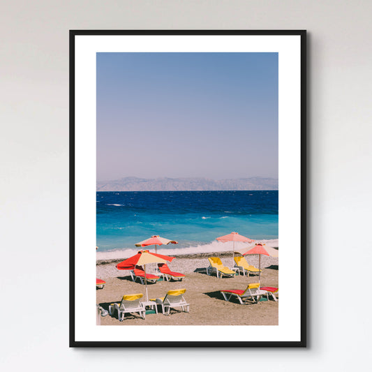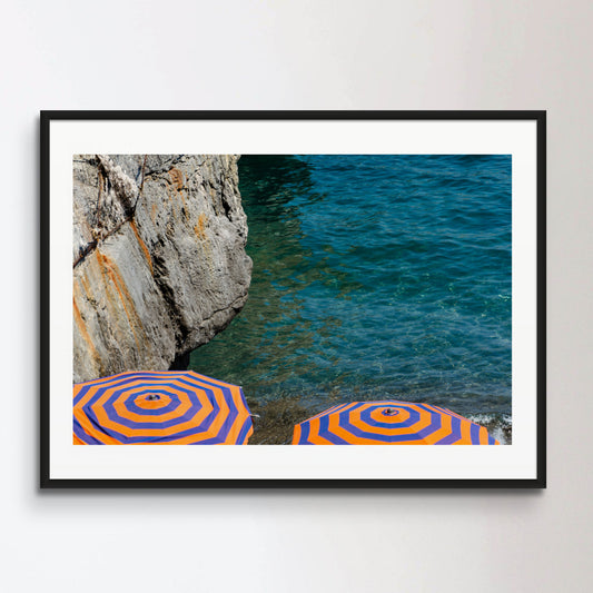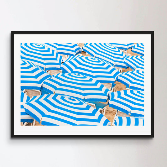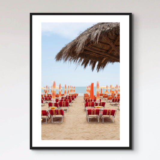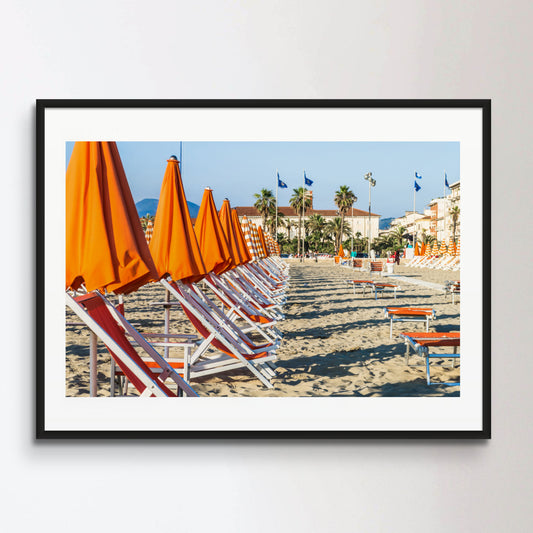 Viareggio beach with colorful umbrellas at sunset, Viareggio, Italy.