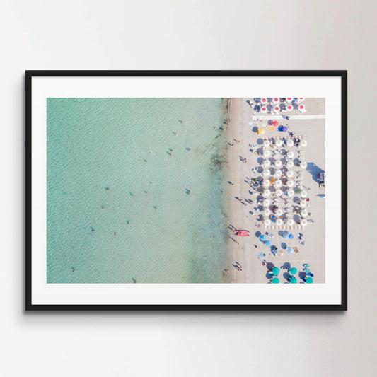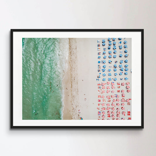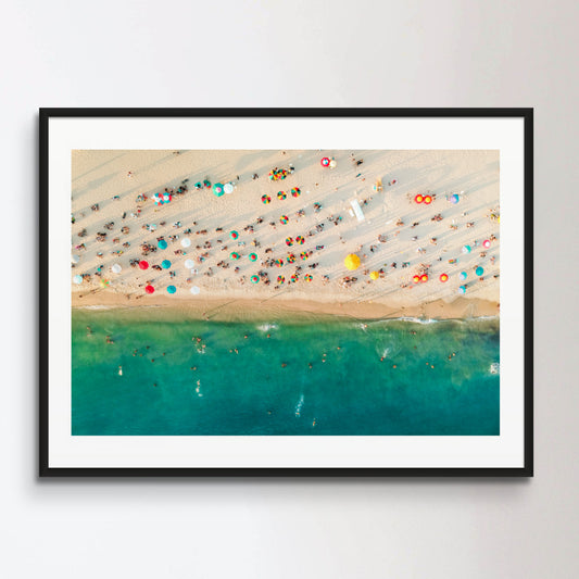 Aerial view of a crowded beach, umbrellas and people on the sand