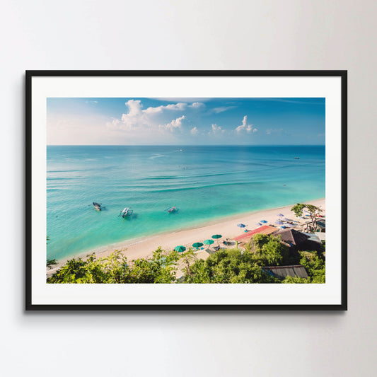 Tropical blue ocean, sandy beach and boats in Indonesia, Bali