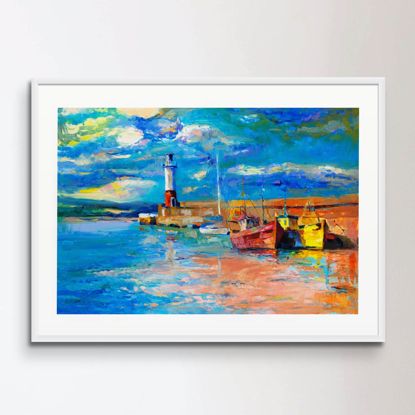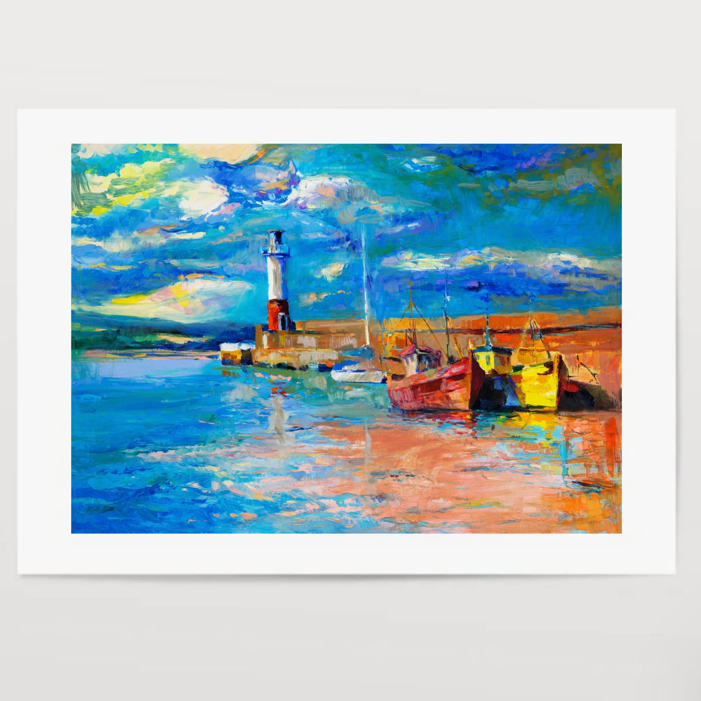 Original oil painting of lighthouse and boats on canvas.Rich golden Sunset over ocean.Modern Impressionism Transform your space with our exquisite, handmade-to-order wall art, available in both framed and unframed options. Each piece is a testament to unparalleled craftsmanship, meticulously created in sizes A4 and A3 with a chic 1-inch white border, and A0, A1, and A2 featuring an elegant 2-inch white border. Whether you opt for the sleek, unframed look or prefer the refined elegance of our frames, our prints are designed to be versatile, fitting seamlessly into any decor style. Printed on premium-quality materials, our art prints offer vivid colors and sharp details, making every piece a focal point in your home or office. Perfect for art enthusiasts and interior design aficionados alike, these prints not only enhance your environment but also echo your unique taste and personality. Choose from our diverse collection that ranges from contemporary abstracts to timeless classics, each piece promising to elevate your walls with a touch of sophistication.
